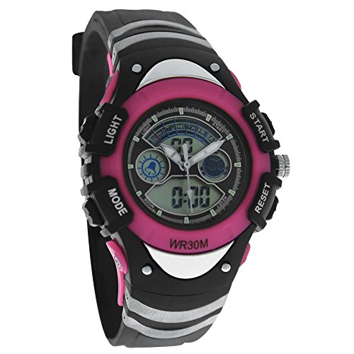 - Montre pour enfants à partir de 8 ans ou pour femmes. Montre sport avec de nombreuses fonctions : Heure, Date, Alarme, Chrono, Eclairage cadran, Etanche 5ATM, Double mécanisme Quartz et Digital : permet l'affichage de 2 fuseaux horaires. Montre sport facile d'utilisation et résistante.Mouvement: Digital avec pile